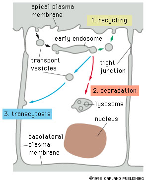Receptors that are not specifically retrieved from early endosomes are transferred to lysosomes and degraded Retreived receptors are returned either to the membrane domain of origin (recycling) or to another domain (transcytosis). If the ligand bound to the receptor stays bound in the acidic environment of the endosome, it will follow the same pathway as the receptor, otherwise it will be transferred to a lysosome and degraded. Fig. 14-30 |