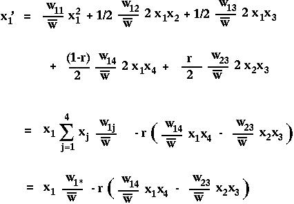 Notice that recombination only enters into these equations when multiplied by (x1 x4- x2x3). This term is known as the linkage disequilibrium, D.