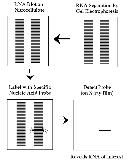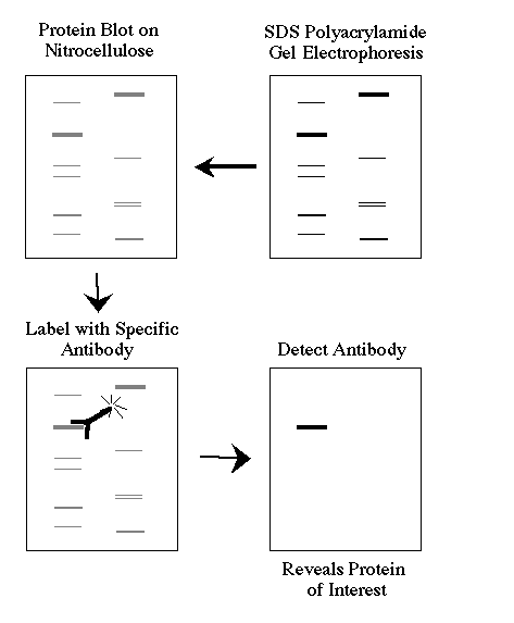 Blotting Methods: To detect a given molecule in an electrophoretically separated mixture, you need a way of detecting the molecule in question. To do so, the molecule(s) must be transferred out of the gel and onto a filter. The transfer of molecules out of the gel and onto the filter conserves the spatial organization of the molecules and can be done by capillary transfer or electrophoretically. The filter is then blocked to prevent non-specific binding, and then challenged with a labelled DNA, RNA to detect DNA or RNA, or with an antibody to detect a specific protein.