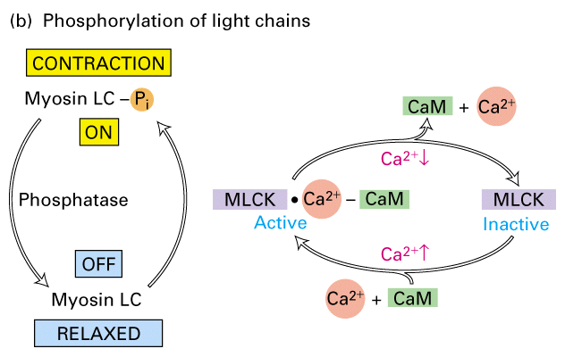 THe activation of smooth muscle myosin requires the phosphorylation of the myosin light chain. There are two enzymes that control this process, myosin light chain kinase (MLCK) and myosin light chain phosphotase. One of the two myosin light chain pairs associated with the myosin in smooth muscle inhibits actin stimulation of the myosin ATPase activity at low Ca2+ concentrations. Phosphorylation of the myosin light chain by MLCK removes this inhibition and the smooth muscle contracts. MLCK is activated by Ca2+ through calmodulin. Calcium binds to calmodulin, and the Ca2+-calmodulin complex then binds to myosin LC kinase and activates it. Because this mode of regulation relies on the diffusion of Ca2+ and the action of protein kinases, muscle contraction is much slower in smooth muscle than in skeletal muscle. The greater the amount of intracellular Ca+2 the more MLCK is activated and the greater the degree of contraction