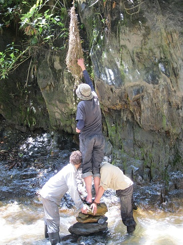 of wet and/or moss-covered rocks, roots, steep banks and stream