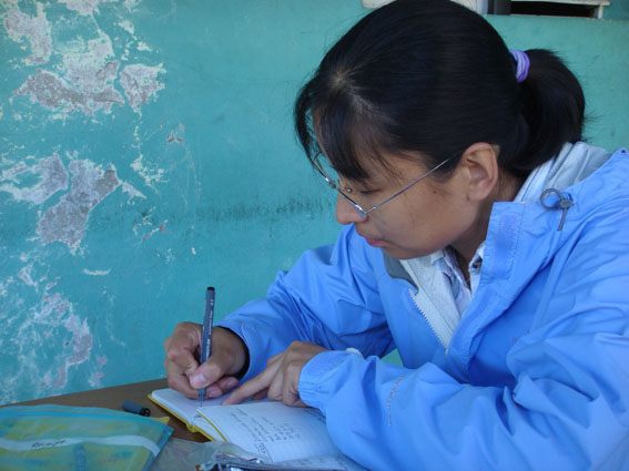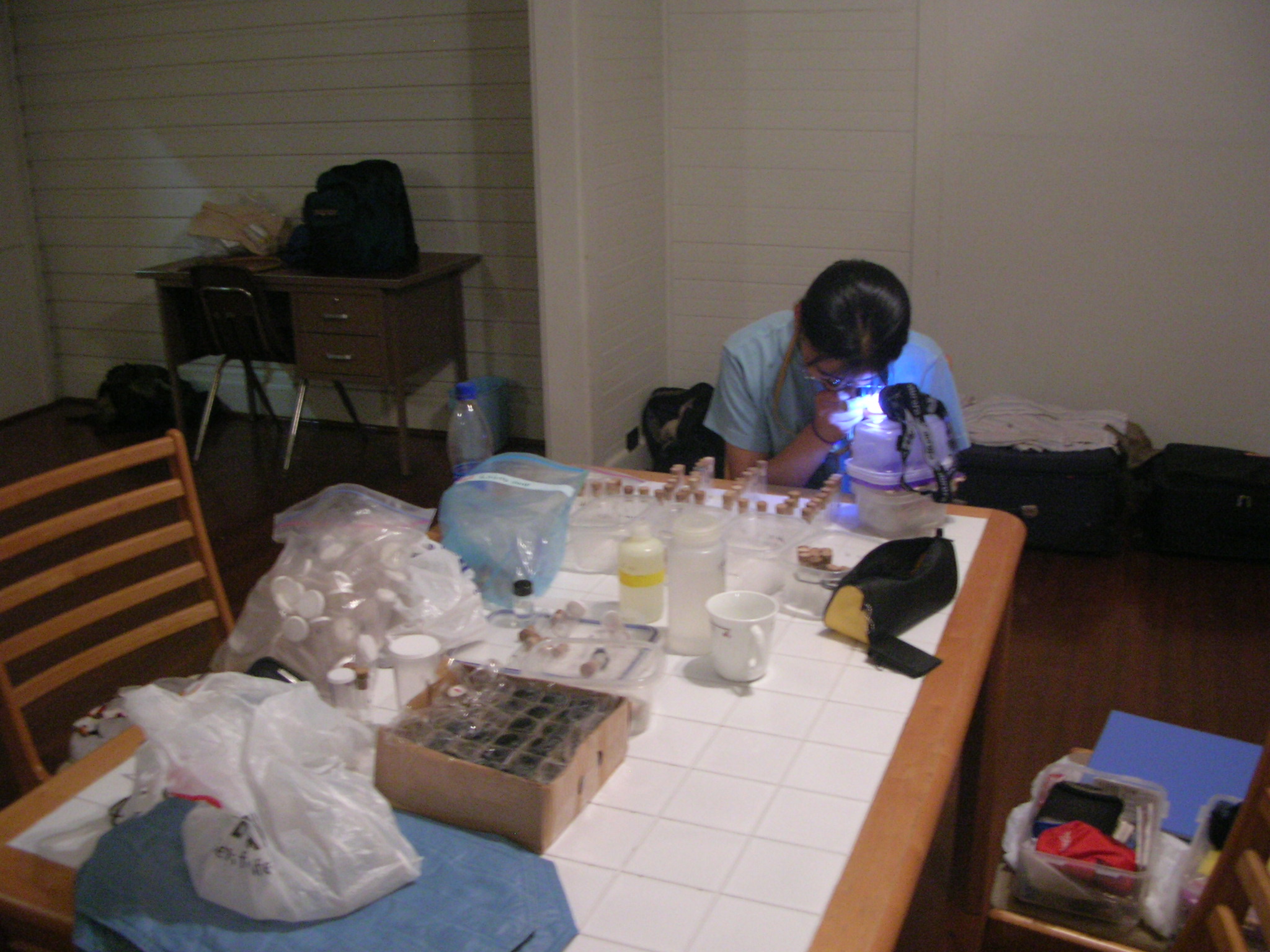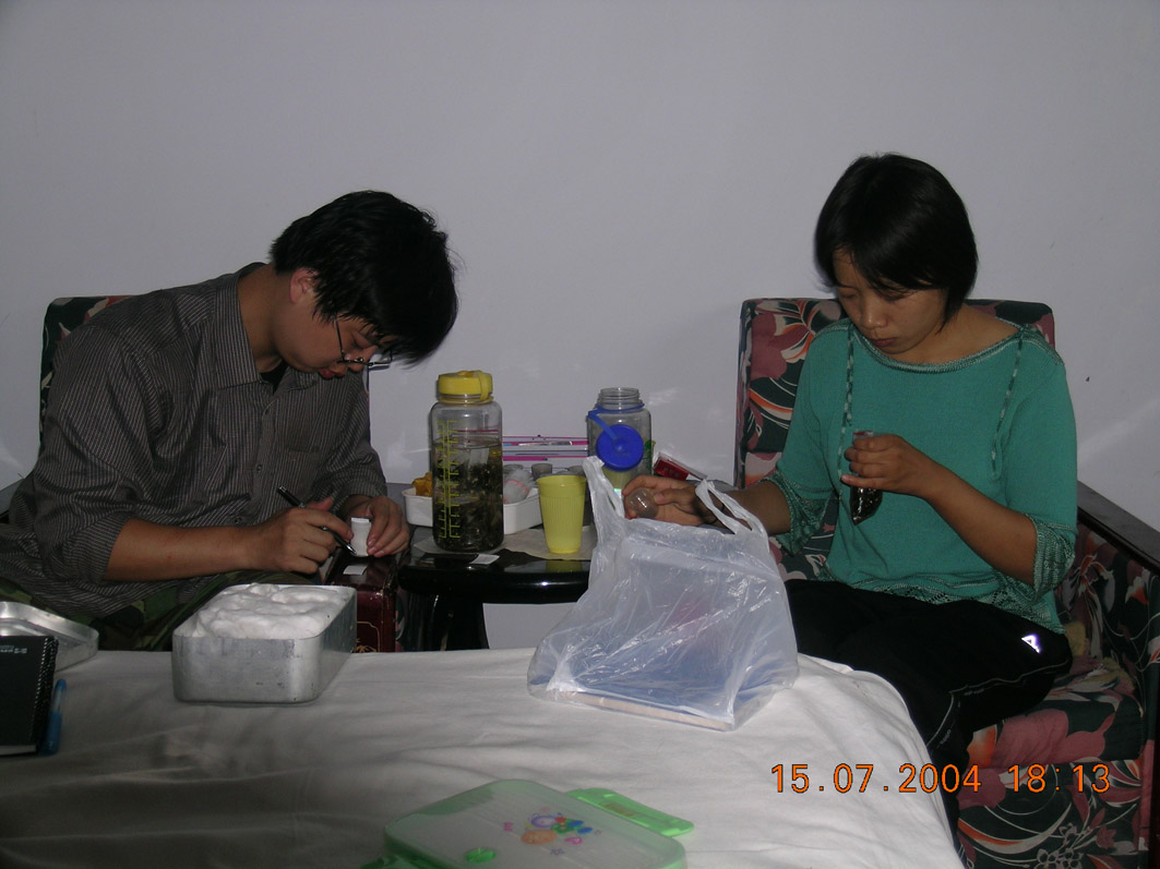 Processing specimens at night (Dong, Shaojie and Lian, Weiguang). Henan, 2004. |
