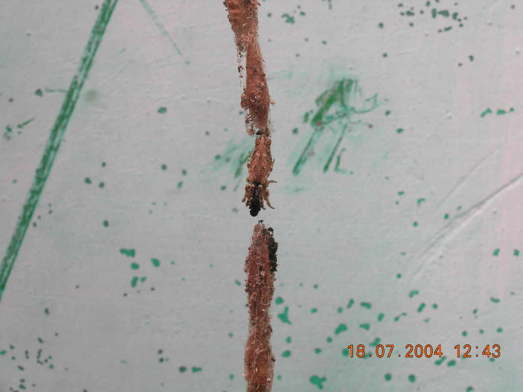 A tarantula in its nest, with remnant exoskeleton of its food. Guangxi, 2004. |