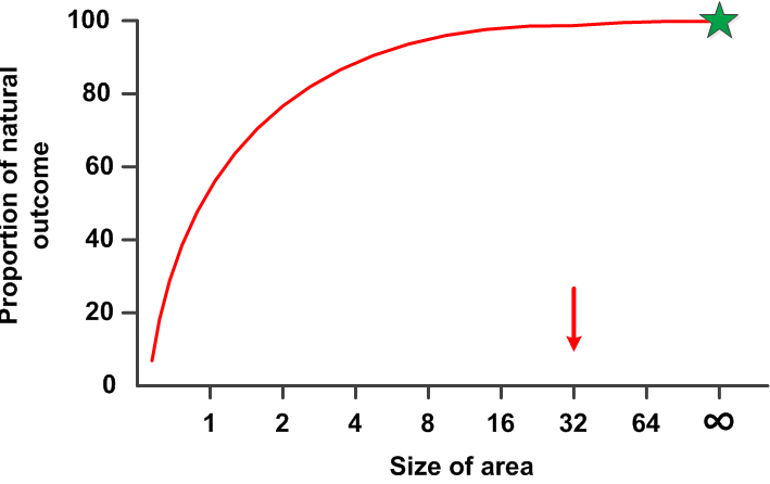 Assume there is some natural outcome known for the particular study. In the case of small rodents this might be that the population fluctuates in periodic ‘cycles’. The question then is what size of enclosure is needed to observe this same population trend. One simple way of looking at this is to ask for islands, what size of island allows a closed population to fluctuate in ‘cycles’. For this particular problem we know that you cannot observe ‘cycles’ in small rooms in the laboratory or even in 1 ha field enclosures.