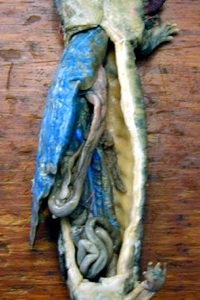 To view this area, cut through the corner of the left jaw of the dogfish and perpendicularly through the center of the gills to the pectoral fin. Fold a paper towel over the teeth and use your scissors to open the mouth wide. Make sure you cut all the way through to the pharynx. Cut horizontally across to the other pectoral fin, making sure you are posterior to the transverse septum. You do not want to cut into the pericardial cavity. You will have to cut through the esophagus until you get to the gill slits on the other side. Pull the lower jaw open and clear out any debris.
