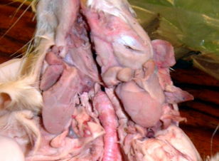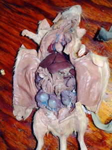 To view the inside of the mouth, cut through the left jaw after prying the mouth open slightly with a folded paper towel over the teeth. Be sure you are not trying to cut through the molars. To open the lower jaw, cut through the soft palate. Do not open the thoracic cavity.