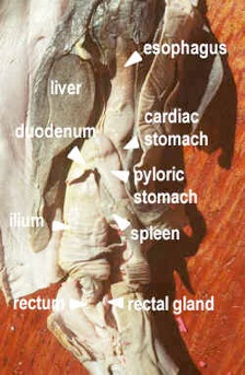 The esophagus extends from the pharynx at the transverse septum and is lined with papillae, stumpy finger-like projections, which form a tight seal to keep water out. Cut into the esophagus to see the papillae and the stomach with its longitudinal folds called rugae. The "U" shaped stomach, with an anterior cardiac limb and a posterior pyloric limb ends in a constricted pyloric sphincter. The anterior portion of the small intestine is the duodenum and the posterior portion if the ileum, which contains an internal subdivision, called the spiral valve. Cut into the ileum to see the valve, which increases the surface area of the intestine. The large intestine (rectum or colon) is a shorter section than the small intestine has a rectal gland entering it. The rectal gland is for salt excretion for osmoregulation. The rectum, the most posterior portion, ends in the anus which projects into the cloaca, a common opening with the urogenital ducts.