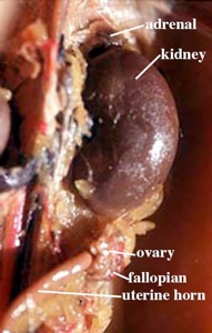 The female reproductive system consists of a pair of ovaries, a pair of fallopian tubes, a pair of uteri and a vagina. The ovaries, from somatic hypomere mesoderm, lay posteriorly to the kidneys, held in position by a mesentery, the mesovarium. From each ovary eggs are shed into the coelom and a fallopian tube with a wide mouth, or ostium receives ova. The tubes coil, and then enter the uterus. The uteri from both sides join in the midline to form a "V’ shaped structure. Each arm of the Y is formed by the cornua, or horns of the uterus, and the base is the body of the uterus. Such a type of uterus is termed a bicornuate uterus. The uterus joins the vagina at the posterior end of the short body of the uterus. The projection of the uterus into the vagina is known as the cervix. The urethra is joined ventrally onto the vagina. The common passageway to the outside housing the separate ducts, urethra and uterus is the vestibule. Cut into it and trace the ducts. The external portion of the vagina is the vulva. At the ventral side of the vestibule near its orifice is a small structure, the clitoris, which is the homologue of the penis of the male. In rats, it encloses the end of the urethra and conducts urine to the outside. At the edges of the vestibule are the labia minora derived from genital folds and the labia majora derived from genital swellings, which are homologues to the scrotal sac of males.
