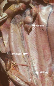 In the female, which matures at 18-21 years, locate the two large ovaries, which look like small lobes of the liver. They may be swollen with eggs covered in yolk. The eggs move from the ovary into the body cavity and then into the opening (ostia) of the two oviducts, called Muellerian ducts. They are silvery tubes on top of the kidneys. The oviductual gland provides albumen and makes egg cases in some species. It may be large or small depending on the season. 6-7 embryos grow in the oviduct (uterus) for 20-24 months being nourished by the yolk, which is absorbed when they are born. They obtain some nutrients and gas exchange from the mother.