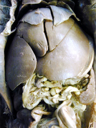The dark reddish brown lobes of the liver (five in rat, six in cat) are attached to the diaphragm. The central lobe has a gall bladder in a cat, but it is absent in the rat, although both animals have a bile duct leading to the anterior duodenum. The mesentery called the greater omentum, stretching from the spleen to the duodenum contains the two lobes of the pancreas, which look like pink granular bubble gum. One lobe runs from the pyloric sphincter to the spleen, the other along the edge of the duodenum. They meet anteriorly forming one duct, which enters the duodenum beside or with the bile duct. The dark reddish brown spleen is an elongate lobe on the left side just below the stomach.