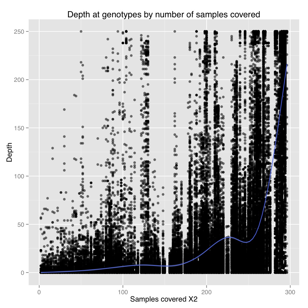 I also plotted number of samples covered by depth at a genotype for 1000 sites. From this we can see that there is a general positive correlation between number of samples covered and depth at those genotypes. So sites that were only sequenced in a few individuals were sequenced at low coverage, and sites that were sequenced in everyone were sequenced at high coverage. It suggests there are preferential portions of the genome where GBS works better, perhaps due to the chromatin.