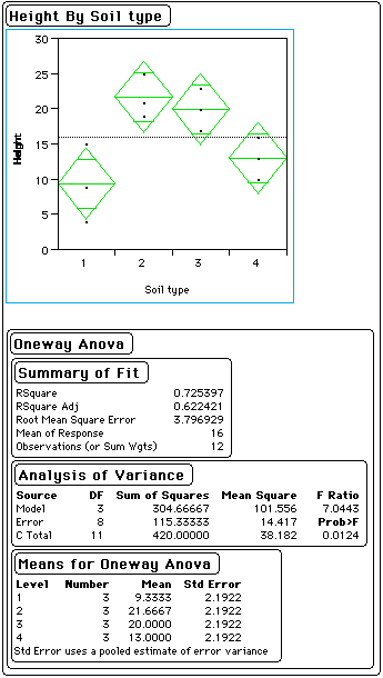 3. A plant ecologist wishes to test the hypothesis that the height of species X depends on the type of soil it grows in. She measures the height of 3 plants in each of 4 plots representing 4 different soil types. The results are tabulated below. (Height in centimeters.) Do the results support her hypothesis, assuming normality and equality of variances?