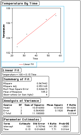 . What is the best estimate of temperature from time after injection? Calculate.Regression. Temperature = 100 + 0.13 Time (see below)