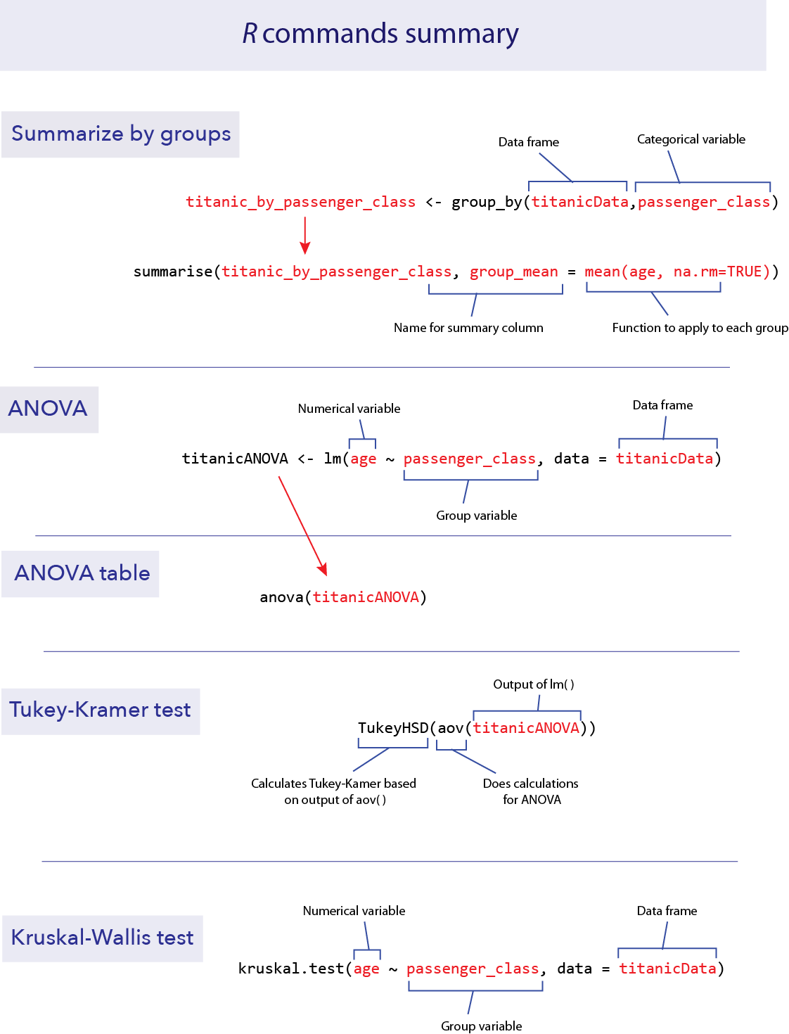 For example, to compare differences in mean age among passenger classes on the Titanic, this formula is