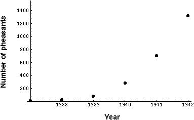 In 1937, two cocks and six hen pheasants were introduced onto an island off the coast of Washington. Over the next five years the population experienced exponential growth (Lack 1954):